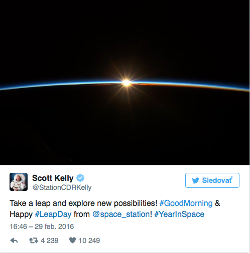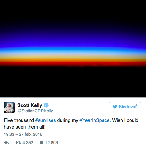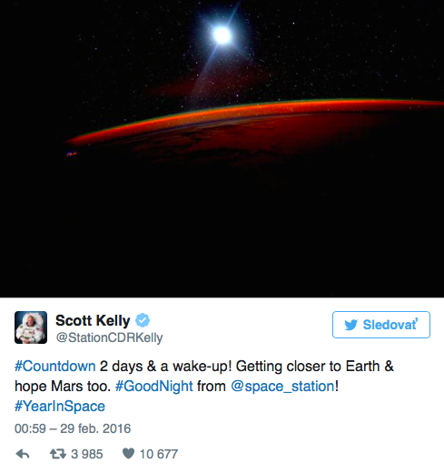Americký astronaut Scott Kelly sa vracia po dlhom roku strávenom vo vesmíre znovu na planétu Zem. Dlhé obdobie trávil na Medzinárodnej vesmírnej stanici, na ktorú bol poslaný dňa 27. marca 2015. Počas dlhých mesiacov prežitých vo vesmíre udržiaval so Zemou a so svojimi fanúšikmi.