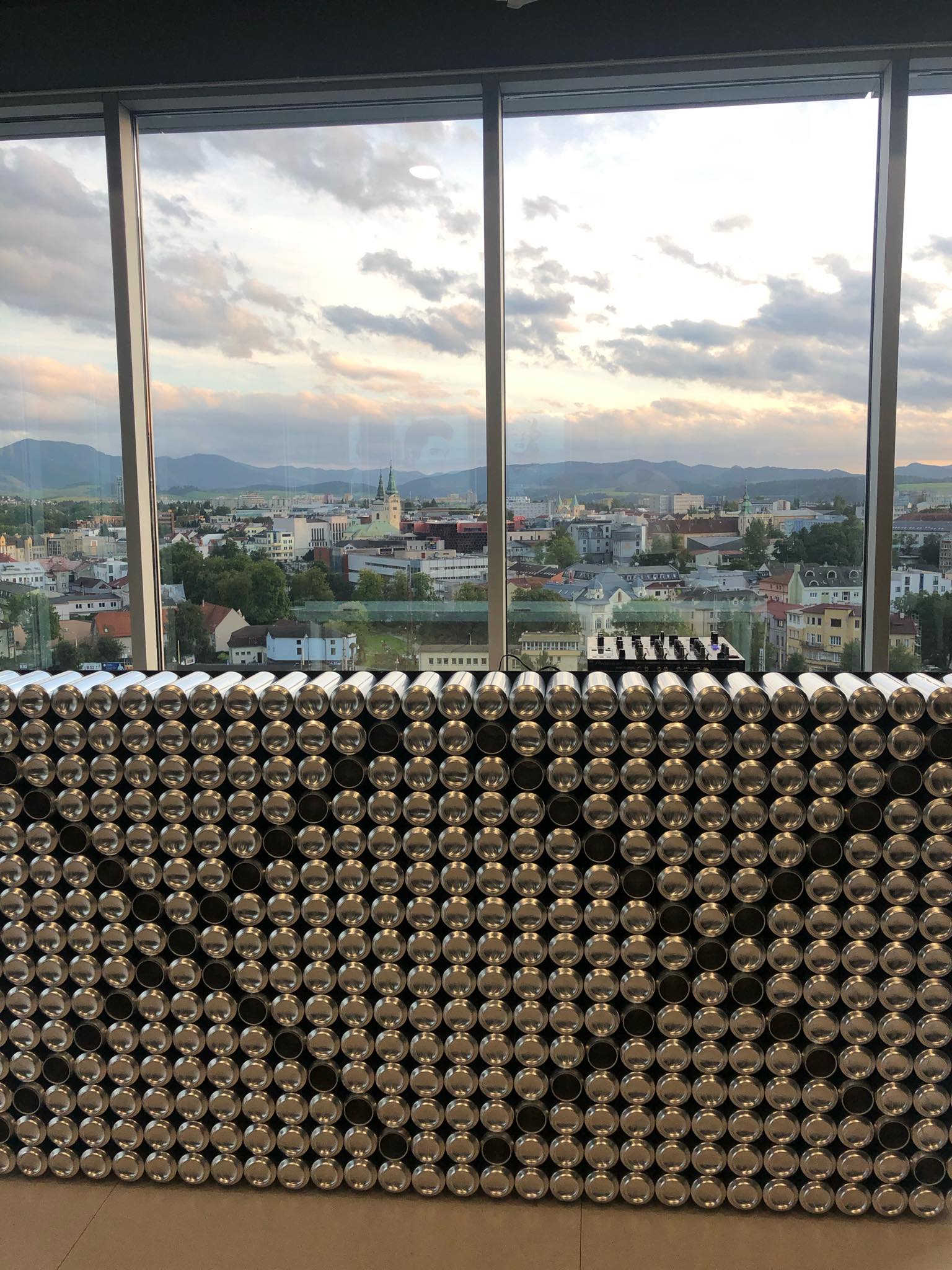 Otvárame dvere a oči nám okamžite padnú na ikonický strop poskladaný takmer z 20 000 plechoviek, ktorý nám na prezentáciu zapína manažérka baru. Ťažko sa to opisuje, silný audiovizuálny zážitok, máme dojem polárnej žiary niekde za polárnym kruhom. Vkusne zariadený interiér, dizajnový nábytok a ostatné svetelné efekty upútavajú už na prvý pohľad.
